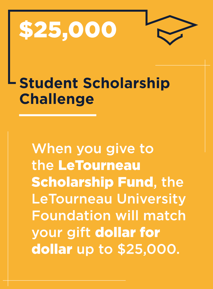 Gifts in this area primarily support student scholarships, helping lower the cost of a LeTourneau education and making it possible for more students to attend. For many, this support is the difference between pursuing their degree—or not.