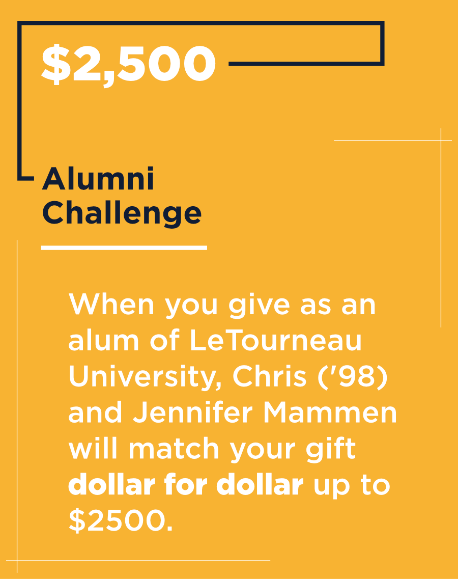Giving Day is a time for the LeTourneau community to come together around a shared purpose. Today, we gather in a shared act of generosity. This year, we are Called to Build—investing in students through opportunity, discipleship, and innovation. Every gift, of any size, helps shape lives and support the incredible work God is doing through LeTourneau University.