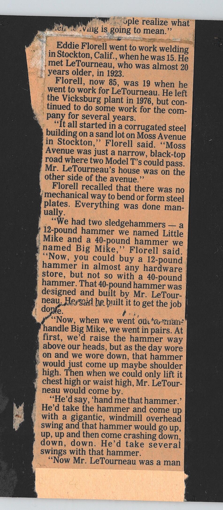 “Now, when we went out to man handle Big Mike, we went in pairs. At first, we’d raise the hammer way above our heads, but as the day wore on and we wore down, that hammer would just come up maybe shoulder high. Then when we could only lift it chest high or waist high, Mr. LeTourneau would come by.